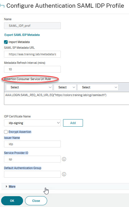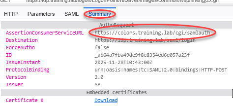 It disappears immediately when you simply enter true in the field instead of a meaningful expression. Of course, this is not a good solution. The correct value is AAA.LOGIN.SAML_REQ_ACS_URL.EQ(‘https://<SP-FQDN>/<SP's assertion consumer URL>’). If you do not know the correct value, you can check the assertion that the SP posts to the IDP. I recommend the browser plugin SAML-Tracer for this purpose. Find the message (highlighted in orange) from the client to Citrix NetScaler IDP, then click Summary in the lower field. The AssertionConsumerServiceURL is the value you are looking for. In my case, it would be https://colors.training.lab/cgi/samlauth and the correct expression would therefore be AAA.LOGIN.SAML_REQ_ACS_URL.EQ(‘https://colors.training.lab/cgi/samlauth’).