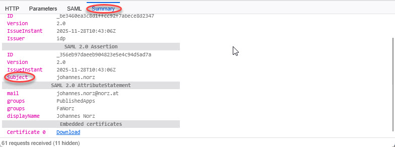 Another reason could be that the username used to log in to Citrix NetScaler IDP is not the one expected by the application. In this case, you also need to create a new attribute in which the correct attribute from the directory is transferred. I have attached a screenshot of the SAML tracer, where you can see the subject attribute and self-defined attributes.